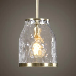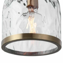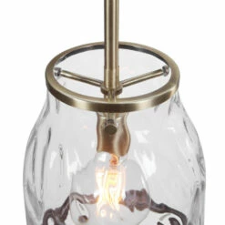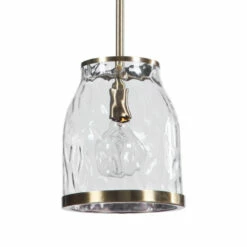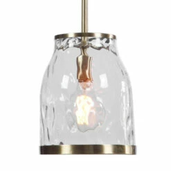 With an interesting bell shape in clear watered glass our 1 Lt. mini pendant offers updated charm with a nod to traditional looks. The antique brass finish stands out on the rich lower ring finishing the glass edge. With 1-60 watt max Edison socket and includes 1-40 watt clear G95 antique style bulb. Supplied with 15 feet wire, and 3-12 inches stems and 1-6 inches stem for adjustable installation.