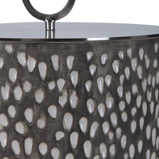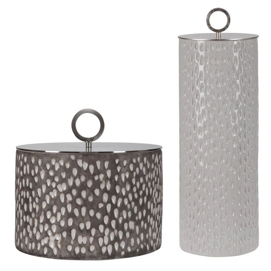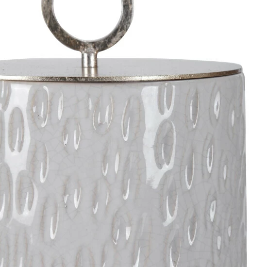 Ceramic containers feature carved detailing and are finished in off-white and smoke grey crackle glazes with respective aged gold and brushed nickel finished lids.