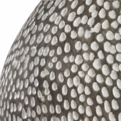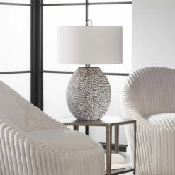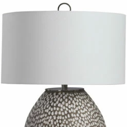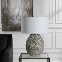 This ceramic table lamp features a heavily pitted surface finished in a combination of brushed rustic grey and crackled gloss white glaze, paired with brushed nickel plated iron details. The hardback drum shade is a white linen fabric with light slubbing.