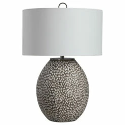 This ceramic table lamp features a heavily pitted surface finished in a combination of brushed rustic grey and crackled gloss white glaze, paired with brushed nickel plated iron details. The hardback drum shade is a white linen fabric with light slubbing.