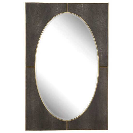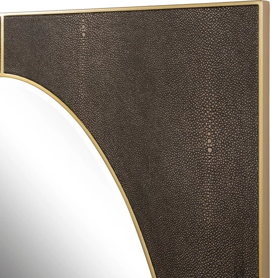 Classic and sophisticated, this mirror features a grey faux shagreen embossing surrounded by delicate antique brushed brass detailing. The piece features a 1-inch bevel and may be hung horizontal or vertical.