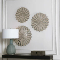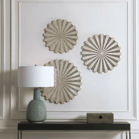 Showcasing a floral motif, this set of three features antique mirrored rounds with naturally finished ash veneer accents.