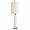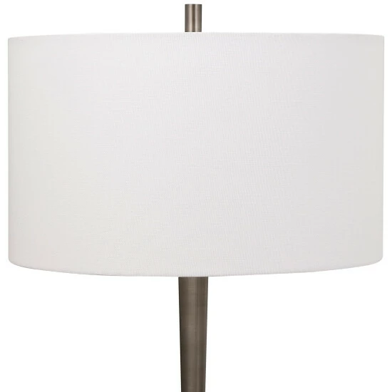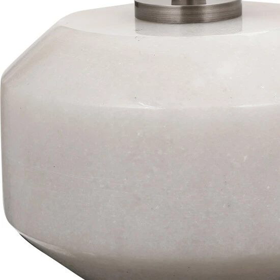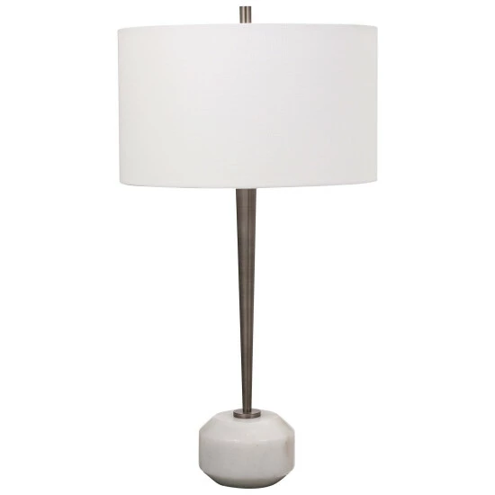 Clean and contemporary, this table lamp showcases a tapered steel base finished in black nickel accented by a hefty white marble foot with subtle black veining. A crisp white linen fabric drum shade completes the look.