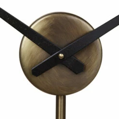 Modern table clock features a steel construction, finished in antique brushed brass with aged black accents. Quartz movement ensures accurate timekeeping. Requires one “AA” battery.