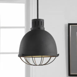 This industrial farmhouse 1 Lt. pendant is a classic. Old school & modern at the same time featuring a textured black outer finish and lower wire cage with a high gloss white inner finish. 1-100 watt max, Edison socket. Includes 15 feet wire, with 3-12 inches stems and 1-6 inches stem for adjustable installation.