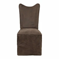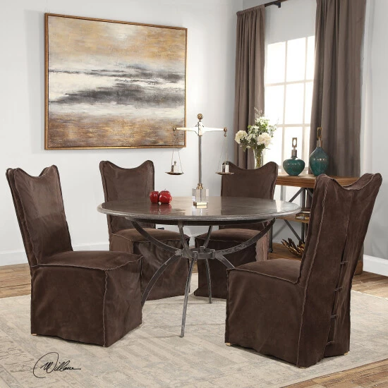 Thick top grain nubuck leather slipcover chair in a distressed hand-sanded chocolate with a tailored double stitched design and casual flange edges, featuring a button closure back. Because leather is a natural product, both texture and color will vary slightly from hide to hide and within the same hide. Slipcovers packaged separately. Packed 2 per box but priced individually.