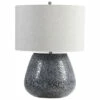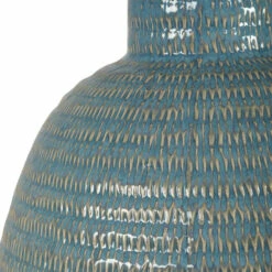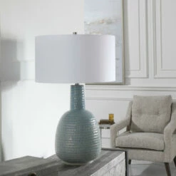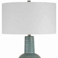 Simple yet sophisticated this ceramic table lamp is finished in a distressed light aqua glaze with intricate hand carved texture, accented by brushed nickel details. A white fabric drum shade completes the look.