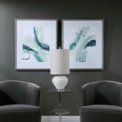 These abstract watercolor style prints showcase shades of teal, light green, and aqua and are accented by double white matting and a driftwood grey frame. Each print is placed under glass.