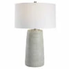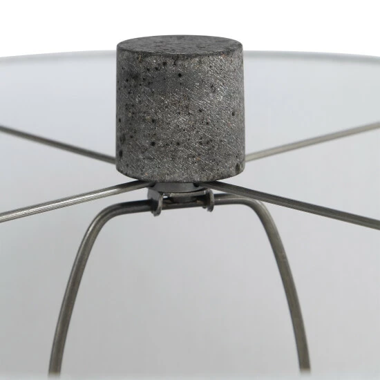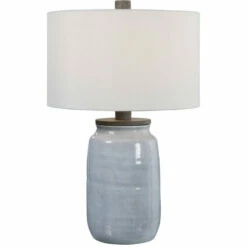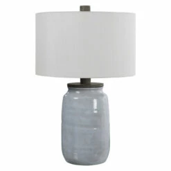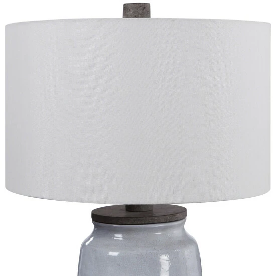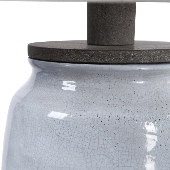 This ceramic table lamp is finished in a light blue crackle glaze, accented with aged charcoal stained concrete details. The round hardback drum shade is a white linen fabric with light slubbing. Due to the nature of fired glazes on ceramic lamps, finishes will vary slightly.