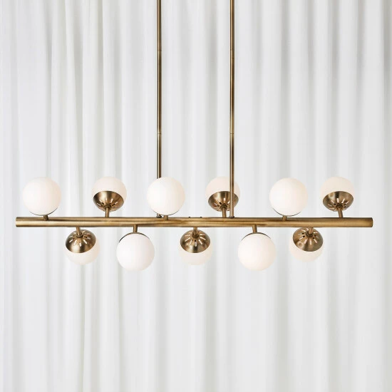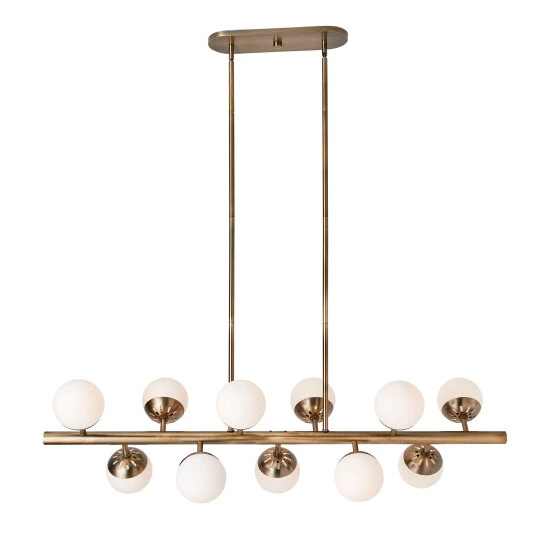 Designed with mid-century roots but featuring a linear center structure finished in a warm antique brass and accented with 5″ matte white opal globes yields a modern take on vintage inspiration. Supplied with 20′ wire, 6-12″ stems and 2-6″ stem for adjustable installation. With 11-60 watt max candelabra sockets for G16.5 bulbs.