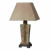 Thick clear glass accented with brushed nickel plated details. The round hardback drum shade is a silken champagne bronze fabric with natural slubbing.