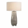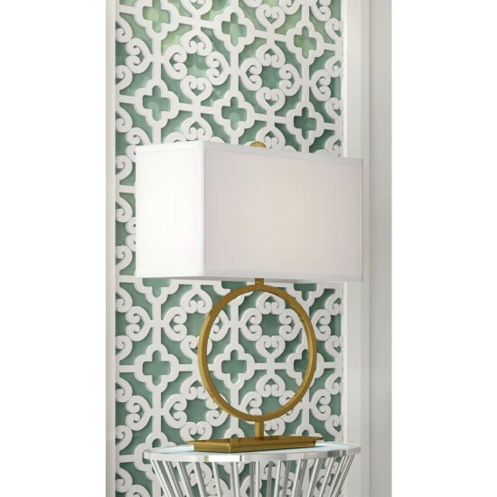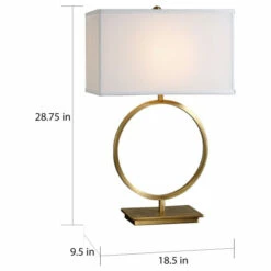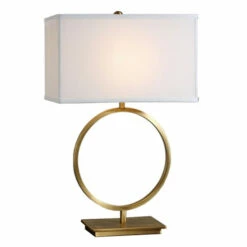 Bring your decor to a sophisticated level with this metal table lamp on display. Featuring a large, circular shape on the base of the lamp to enhance the look of your home or office, this table lamp boasts a metal base in plated brushed brass for long-term use and durability.