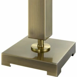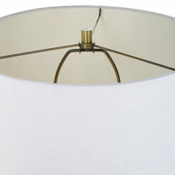 This sophisticated table lamp showcases a streamlined metal column base finished in antique brass. The round hardback shade is covered in white linen fabric.