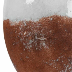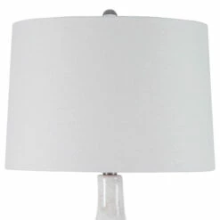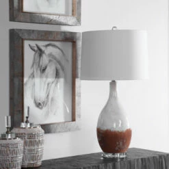 This table lamp features a ceramic base finished in an earthy terracotta rust that transitions into a crackled aged white glaze, accented with brushed nickel plated details and a thick crystal foot. The slightly tapered round hardback shade is a white linen fabric.