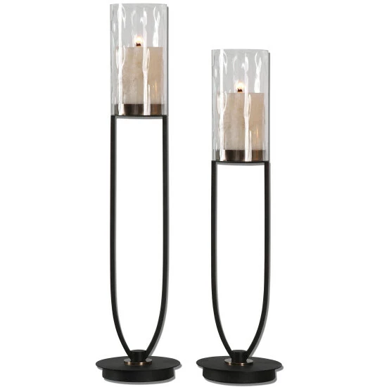 Matte black open design iron work with coffee bronze details, clear water glass globes and two, 4 inches x 5 inches distressed beige candles.
