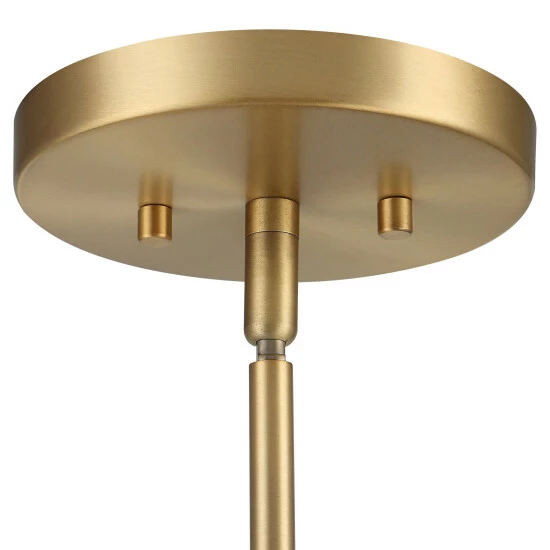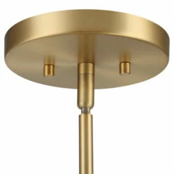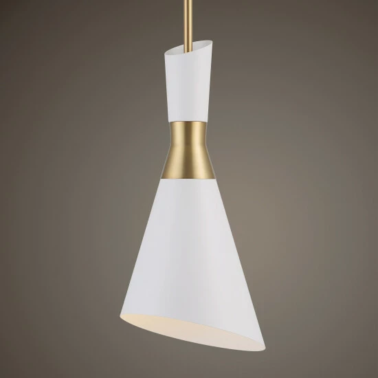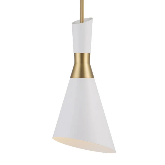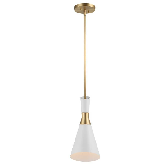 Modern lines & shapes in a white & antique brass finish with a retro feel give us a classic looking mid-century cone pendant. Includes 1-60 watt max edison socket. Supplied with 15′ wire, 3-12″ stems and 1-6″ stem for adjustable installation.
