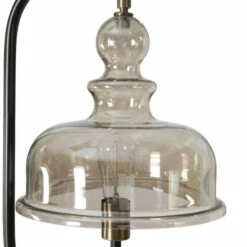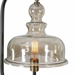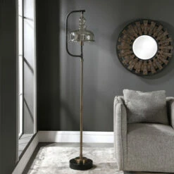 This floor lamp features a delicate design finished in a plated antiqued brushed brass and rusted aged black. The piece showcases a gracefully curved light amber glass shade and includes one 60 watt, BT-58 antique style bulb.