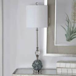 Add a touch of whimsical style to a space with this buffet lamp design by featuring a decorative ceramic calla lilies bouquet finished in a blue grey glaze, paired with crystal accents and polished nickel plated details. A round hardback drum shade in white linen fabric compliments this piece.