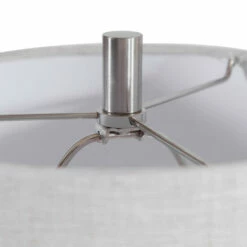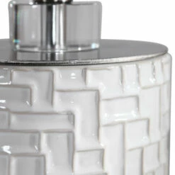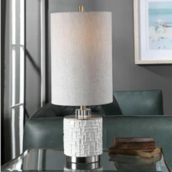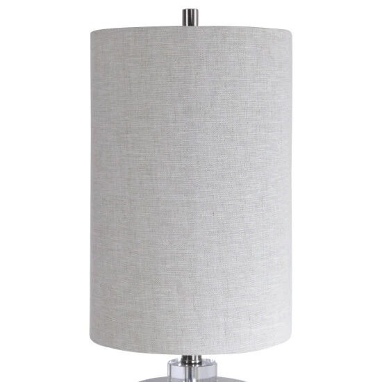 This buffet lamp has a ceramic base finished in a glossy white glaze featuring embossed geometric details that add a retro flair to the design. Brushed nickel plated accents and crystal details highlight the piece. The round hardback shade is light beige linen fabric with natural slubbing.