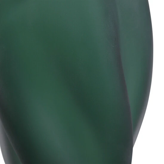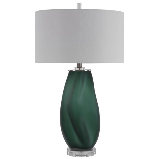 Showcasing an organic shape, this elegant table lamp has a frosted emerald green glass base with brushed nickel and crystal accents. The round drum shade is a white linen fabric.