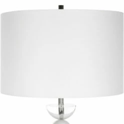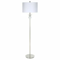 Sleek and refined, this contemporary floor lamp showcases a streamlined iron base in polished nickel with natural white marble and crystal accents. Paired with a hardback white linen fabric drum shade.