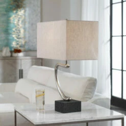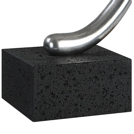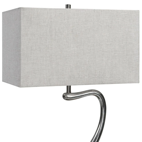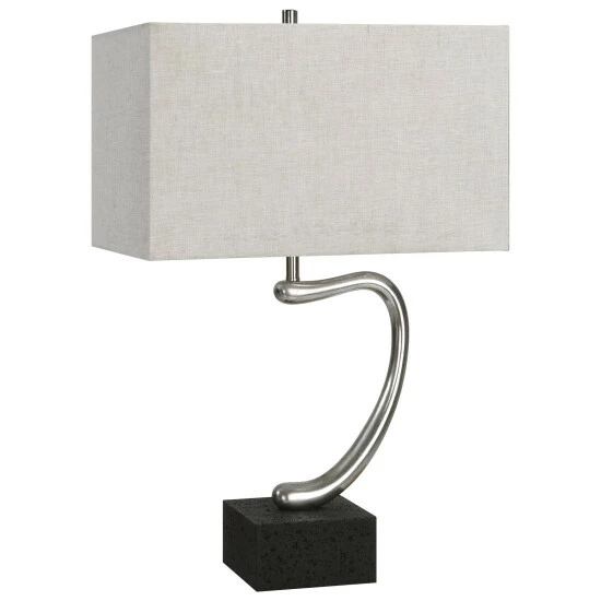 Inspired by contemporary art, this table lamp features an abstract sculpture finished in tarnished silver, accented by a granulated black marble foot that accurately replicates the look of thassos marble. The rectangle hardback shade is covered in a light grey fabric with natural slubbing.