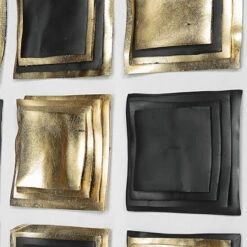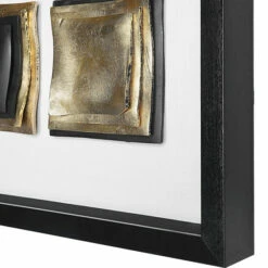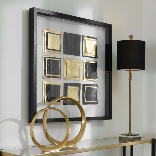 Displaying a modern yet timeless look, this wall art showcases handmade clay squares stacked in varying layers of gold leaf and satin black. A linen backing accents the design and is paired with a solid pine wood shadow box frame in ebony. May be hung four ways.
