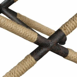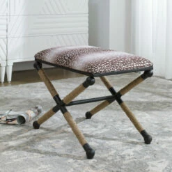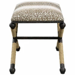 This lodge inspired small bench has a rustic iron frame accented with natural fiber rope details, featuring a fun neutral fawn printed polyester top.