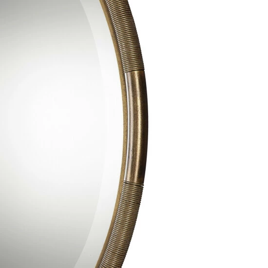 Heavy iron coils surround a petite flat iron inner frame, all hand finished in a lightly antiqued gold leaf. Mirror features a generous 1.25-inch bevel.