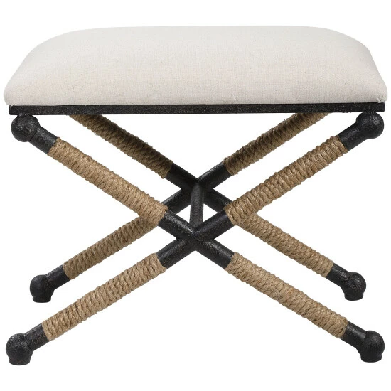 Rustic iron frame with a nautical touch, wrapped in natural fiber rope accents. Cushioned top is a sturdy, cotton in a neutral oatmeal.