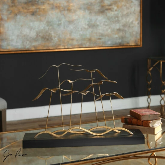 Flock of seagulls, finished in a metallic gold leaf, flying above an aged black distressed wood base.