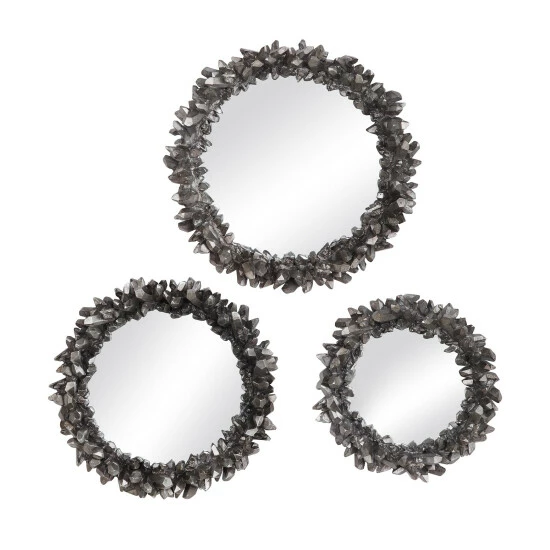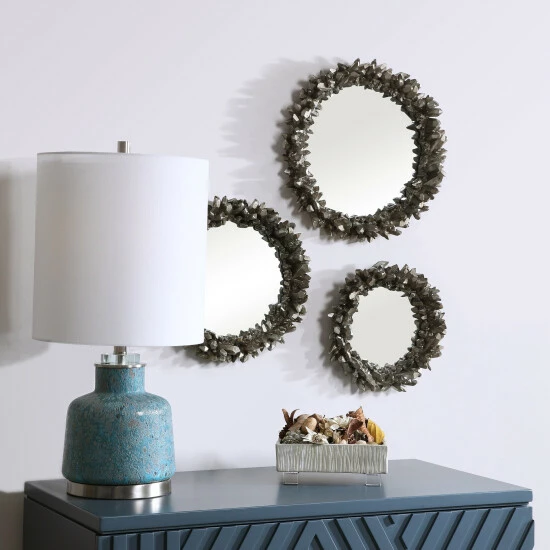 Inspired by worldly adventures and a well traveled lifestyle, this set of three mirrors display a natural rock crystal motif finished in antique silver leaf. Multiple sizes allow for an array of unique display options.