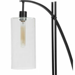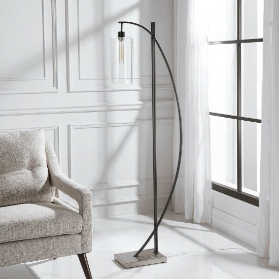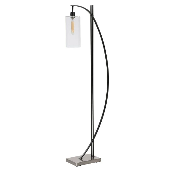 Simple and sleek, this contemporary arc floor lamp is finished in matte black with a steel plated brushed nickel foot and clear glass globe. One 60 watt, antique style, T10 Edison bulb is included.