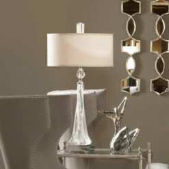 Whether you place it in your living room or bedroom, the Granconatable lamp turns classic style into a new trend. Its stylishtwisted-glass design accents its smooth round drum shade, giving itcontemporary appeal that pairs easily with your room settings, andit turns on or off with a simple flick of the switch.