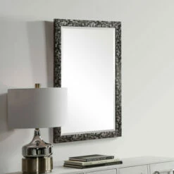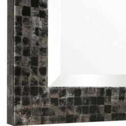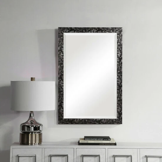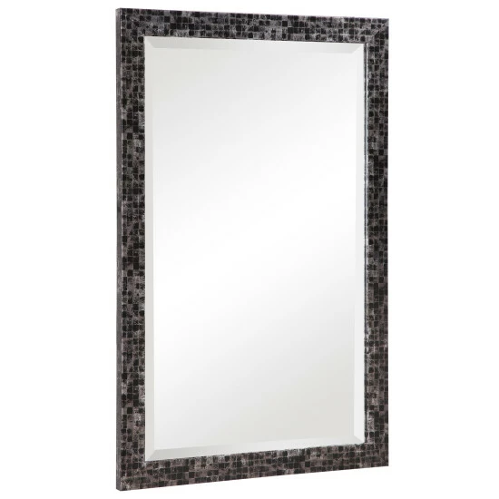 Contemporary style vanity mirror features a grey, silver, and black mosaic style frame. Mirror has 1 inch bevel and may be hung horizontal or vertical.