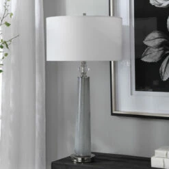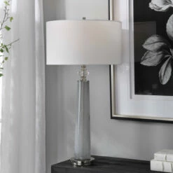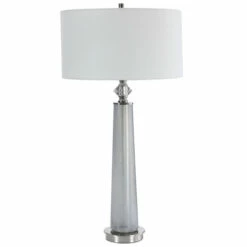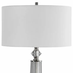 This sleek table lamp features a frosted art glass base in light grey with white speckled texture. The piece is accented by polished nickel details and a crystal ornament. The hardback drum shade is covered in a white linen fabric.