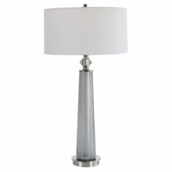 This sleek table lamp features a frosted art glass base in light grey with white speckled texture. The piece is accented by polished nickel details and a crystal ornament. The hardback drum shade is covered in a white linen fabric.