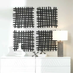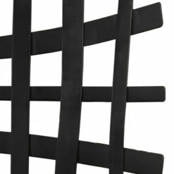 Solid iron wall panel is constructed in an abstract grid pattern, finished in matte black. May be hung four ways.