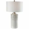 This Guerina table lamp features a scalloped ceramic base finished in a lightly distressed gloss white accented with plated brushed nickel details. The slightly tapered round hardback shade is a light taupe grey linen fabric with natural slubbing. Due to the nature of fired glazes on ceramics, actual finish may vary.