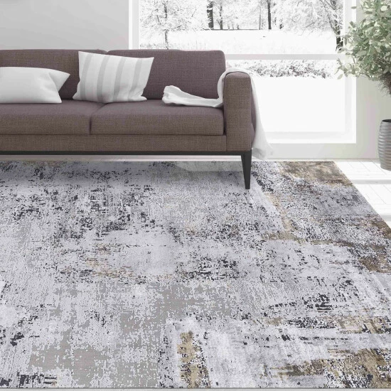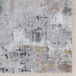 This power loomed rug features an abstract design in multi shades of grey and hints of ivory, with taupe gold detailing, constructed from a mix of polyester and viscose for a soft to the touch feel.