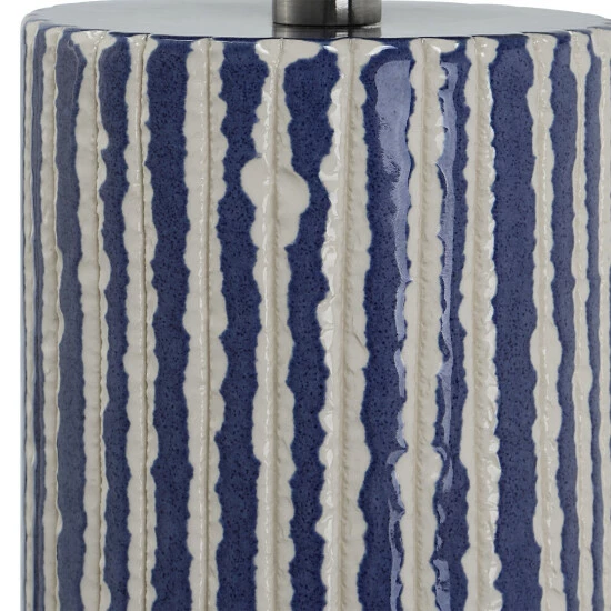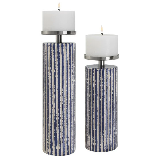 Set of two ceramic candleholders are finished in a vertically striped ivory and cobalt glaze, accented by iron candle cups finished in polished nickel with two 4″x 3″ distressed off-white candles included.