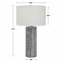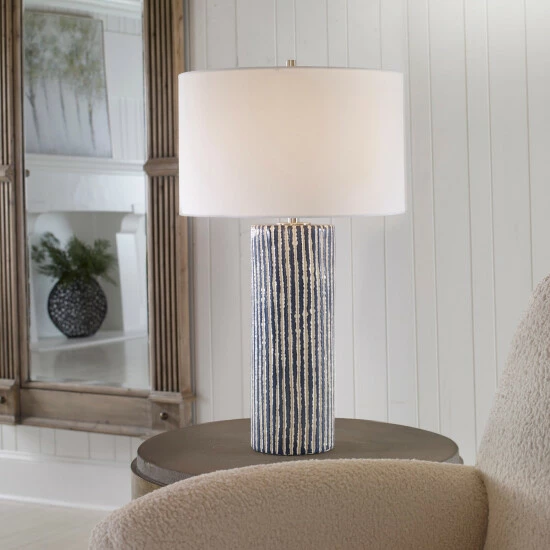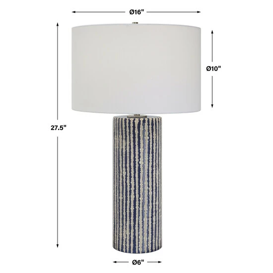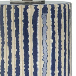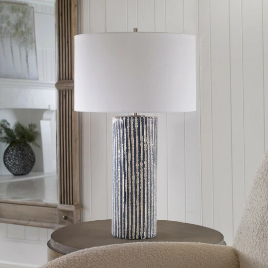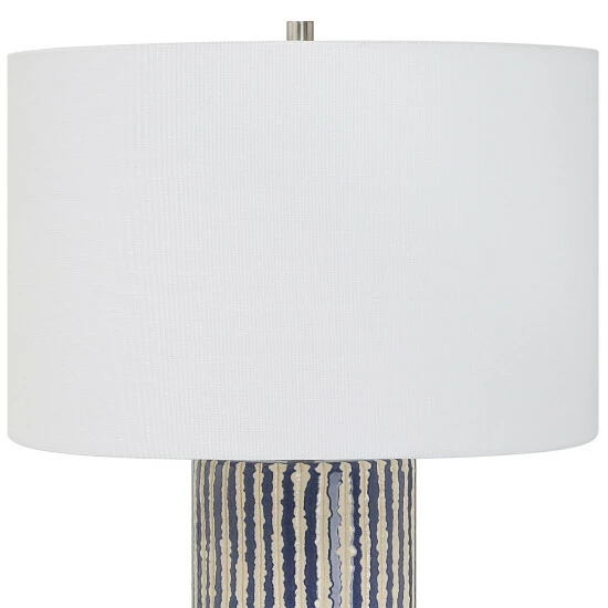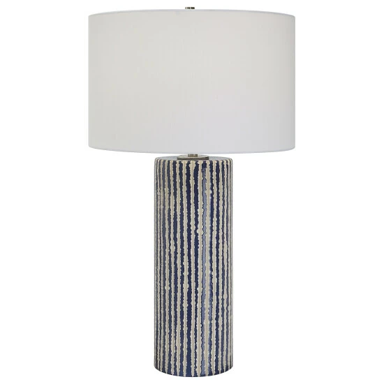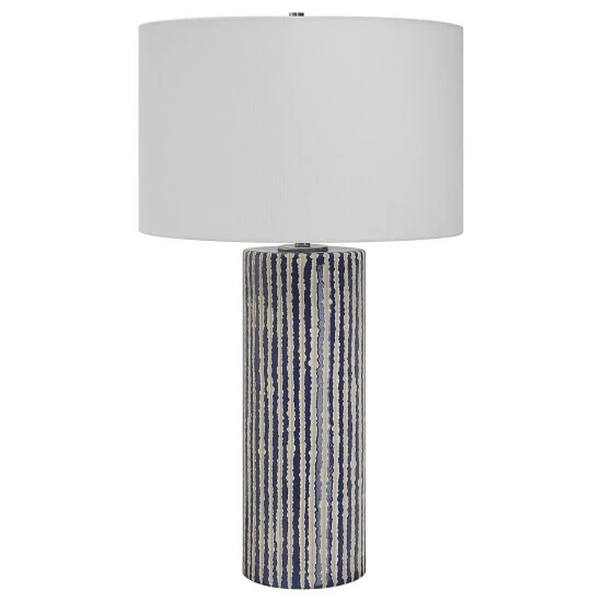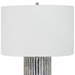 This ceramic table lamp features eye-catching, crudely carved, cobalt glazed stripes with contrasting ivory, accented with brushed nickel details. The round hardback shade is covered in a white fabric.