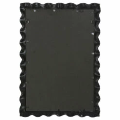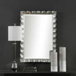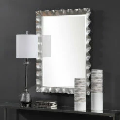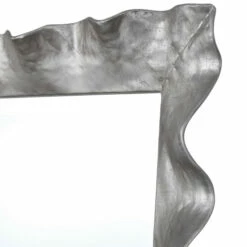 This mirror features a hand forged metal frame finished in silver leaf with an organic, scalloped edge design. A generous 1 1/4 inches bevel is added to this piece, which may be hung horizontal or vertical.