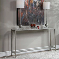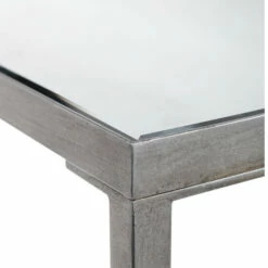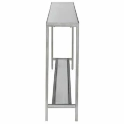 Classic and minimalistic, this narrow iron console table is finished with lightly antiqued silver leaf, inset with a beveled mirrored top, and gallery shelf in clear glass.