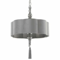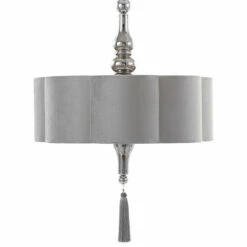 Timeless, refined and lavish our fluted silver mist velvet shade 4-light pendant features plated smoke glass accents on the center column with a chrome finish. We have supplied both an opulent silken silver grey tassel finial and a chrome ball finial so you can customize to match your interior look. 4-100 watt max, Edison sockets. Includes 15 feet wire and 7 feet chain for adjustable installation.