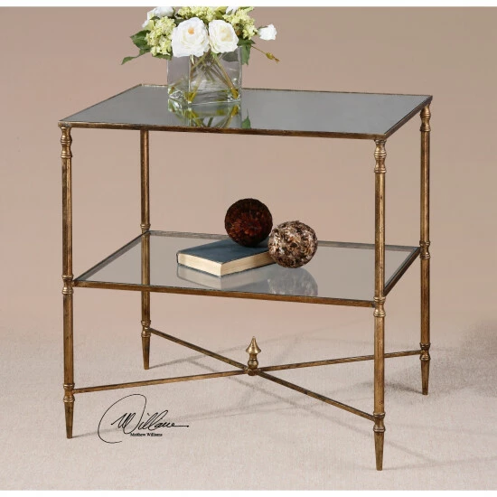 Give your favorite lamp a home on this gorgeous mirrored table featuring a rectangular shape. This table has a gold leaf finish that combines with the two glass shelves for a beautiful, traditional look. Crafted from iron and glass, this table makes a wonderful addition to an eclectic collection of furnishings.