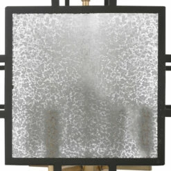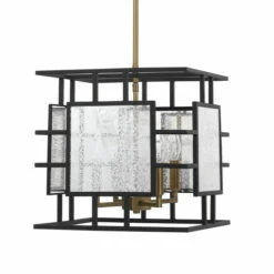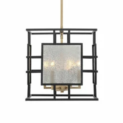 Distressed mercury glass panels enhance the clean line of this 4-light pendant featuring a combination finish of sanded black and antique brass giving an elegant yet orderly look. 4-60 watt max, candelabra sockets. supplied with 15 feet wire, 3-12 inches stems, and 1-6 inches stems for adjustable installation.
