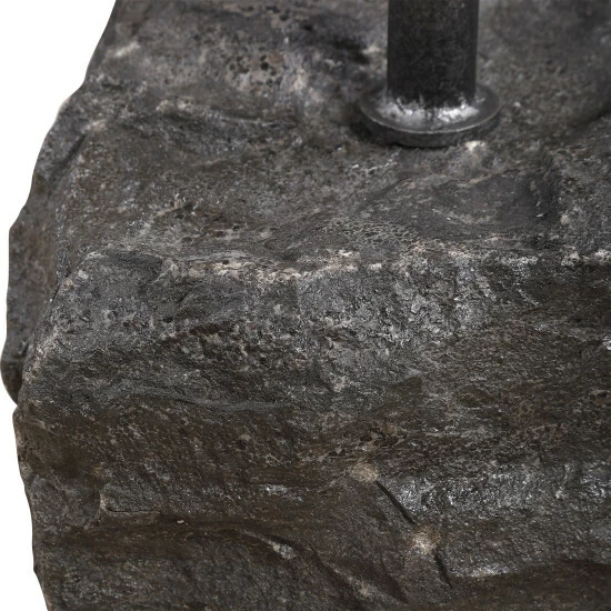 A true rustic centerpiece, this accent table appeals to many design styles with a natural recycled elm top showcasing an inlaid starburst pattern. Accented with an aged iron support element and stabilized by a rough chiseled bluestone block with inherent white marbling and veining throughout.
