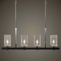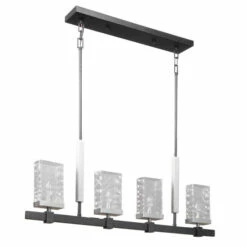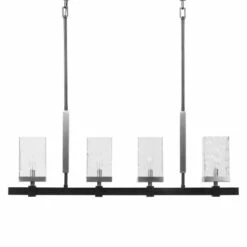 Clean transitional 4 lights island with a textured black finish and brushed nickel accents, featuring unique rectangular clear watered and micro seeded glass. With 4-60 watt max candelabra sockets and also includes 20 feet wire, and 6-12 inches stems and 2-6 inches stem for adjustable installation.
