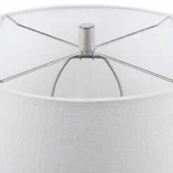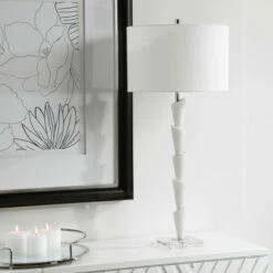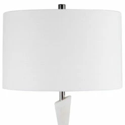 Showcasing a marble look, this table lamp evokes a modern sophisticated style with white and light grey tones that are accented with a thick crystal foot and polished nickel plated details. The lamp is paired with a round hardback drum shade in a white linen fabric.